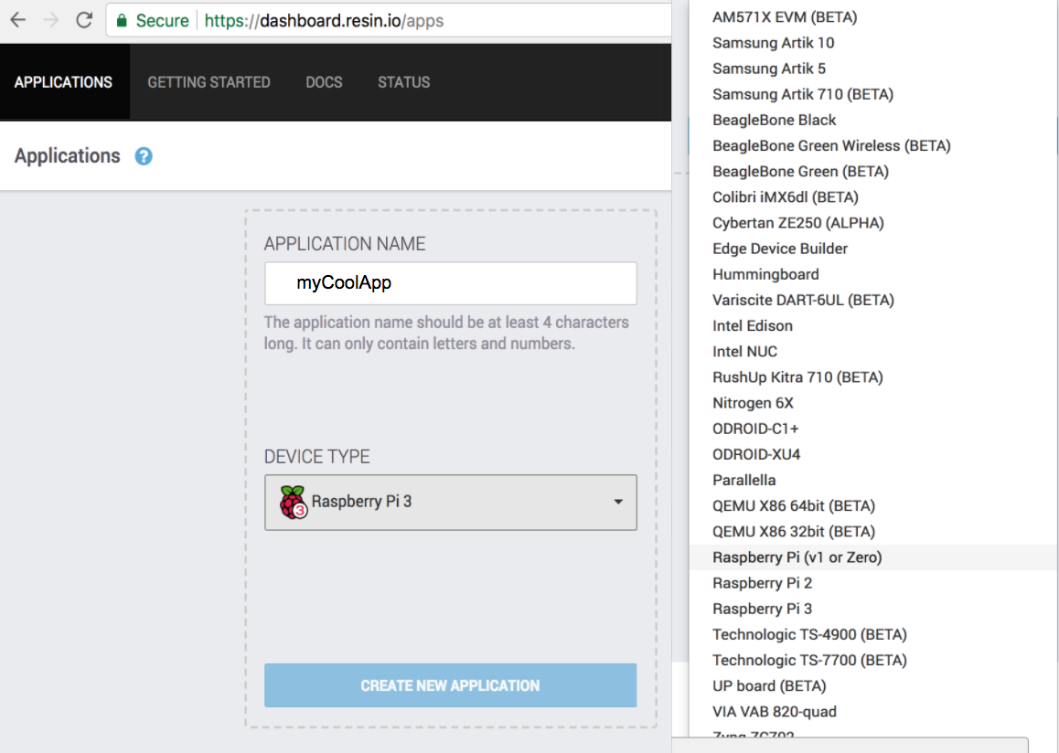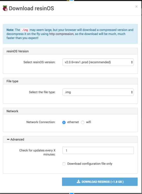 Download the resinOS. Which will give you the Device OS specific for your device. When we created the application Resin.io gave us a remote url to point to the resin server. The url looks likes: